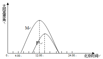 小题2:结合图及前面分析,两地区时不同,A错。M地北京时间12点正午,说明在东八区。P地北京时间14点时正午,说明位于东六区,两地都在东半球,B错。6月太阳直射点在北回归线附近,若两地纬度相同,正午太阳高度是M大,P小,C可能。根据前面分析,从两地的时区看,M一定在大陆东侧,所以不可能同在大陆西侧,D错。