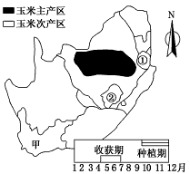 2、单选题 下图是某国家版图,该国的黄金和钻石等储量丰富、世界闻名。矿产开发之前,该国是一个以农业为主的国家。下图是该国(图中①②不属该国领土)玉米生产区的分布和种植、收获玉米的时间。读图回答1—2题。