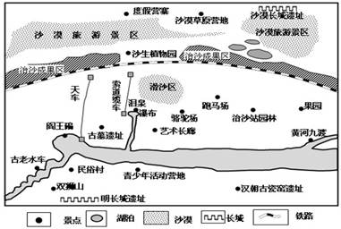 5、综合题 该图为我国某5A级沙漠生态旅游区景观分布示意图。读图回答问题。(10分)