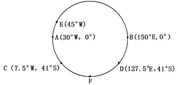 2、单选题 假设地球是正球体,图中O为地心,R为地球半径,a、b为60°S纬线上两点,ab段纬线长度为πR/8,已知a两侧日期不同,b点以东为东半球,以西为西半球,且b正值日出。读图回答下面两题。