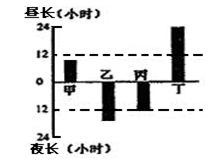 2、单选题 读某日甲、乙、丙、丁四地的昼长或夜长示意图,完成下列各题。