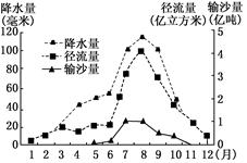 2、单选题 图为我国某河流中游水文观测站测得的多年月平均降水量、径流量、输沙量变化图。读图回答问题。