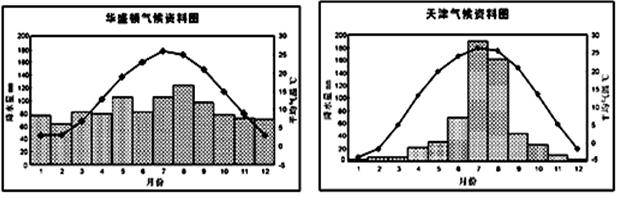 (1)降水:天津降水主要集中于夏季(降水的季节差异大),而华盛顿降水季节分配均匀;(2分)天津的年降水量较少,华盛顿年降水量较多。(2分)