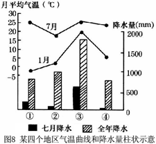 2、单选题 读图8“某四个地区气温曲线和降水量柱状示意”,回答: