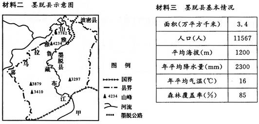 材料一 西藏波密至墨脱的公路被称为墨脱公路,该公路全长约117千米,穿越了嘎隆拉雪山和六条江河。该工程已于2010年12月竣工,至此,全国所有的县均实现了公路通达。