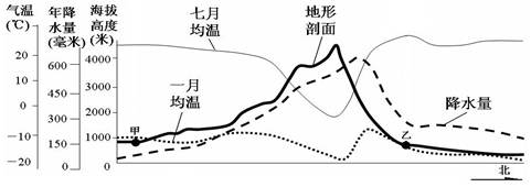 5、单选题 下图为我国某地区各气象要素的分布状况,甲、乙两地水平直线距离约为220千米。读图回答下列各题。