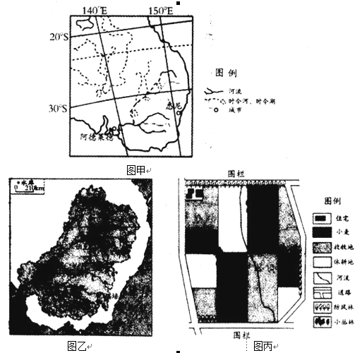 图甲为某区域局部图,图乙是该区域内某流域重要水库分布图,图丙为该流域一个小麦—牧羊农场的土地利用示意图。