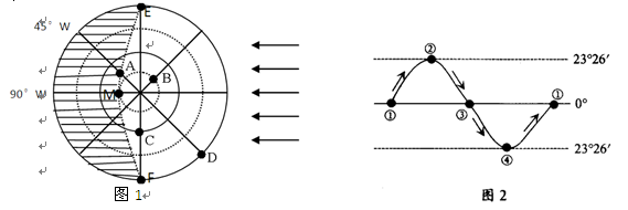 (2)图1所示情形出现时,太阳直射点位于图2中的_____ (填写数码)处。此时地球上正午太阳高度达一年中最大值的纬度范围为 。此时南昌的昼夜长短情况是 。