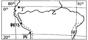 1.利马多大雾天气,主要原因是2.关于图中甲、乙两处气候的说法,正确的是3.与乙处所在气候区比较,丙处所在气候区的昼夜温差较大,主要是因为丙处4.丁地位于赤道附近,但年平均气温仅为13~14℃,主要原因是