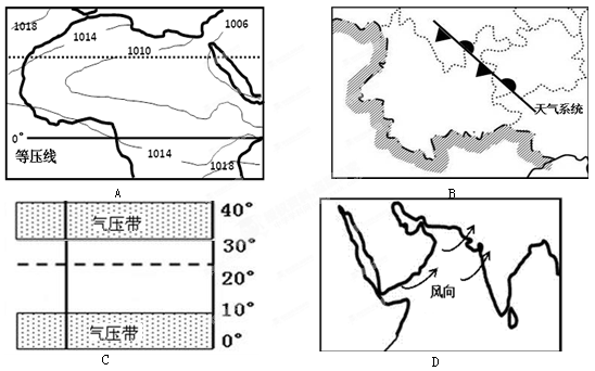 小题2:该地此时为北半球的冬季,图A和图C的气压带向北移动,表示为北半球的夏季;图D南亚盛行西南风,为北半球夏季;而图B表示影响云贵高原地区的昆明准静止锋,是冬季南下的冷锋受地形的阻挡形成的。故选B。