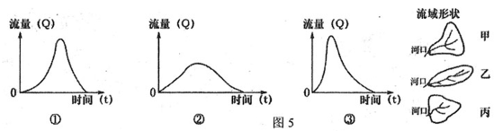 1.图4示意暴雨中心位置对流域汇流的影响。SMD表示暴雨中心发生在上、中、下游区域或均匀分布时汇流过程。若暴雨中心发生在上游区域时,正确的是2.图5示意流域形状对流域汇流的影响。在其他条件相同时,不同流域形状会产生不同的汇流过程。流域形状甲、乙、丙分别对应汇流过程正确的是