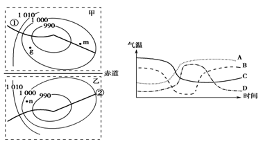 2.根据上题的分析,①锋面是北半球的冷锋,降水在锋后。g位于冷锋锋前,锋面过境前受暖气团控制,气温高,气压低,天气晴朗。过境时有刮风,降雨,降温现象,气压升高。过境后,受冷气团控制,气温低,气压高,天气晴朗。所以右图中曲线只有C符合,所以C对。A、B、D错。