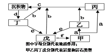 本题解析:试题分析:根据图示的岩石和岩浆之间的转化关系判断,丁为由沉积物转化而形成沉积岩;判断cd为形成沉积岩的外力作用;沉积岩可在地下深处发生变质作用而生成变质岩,判断e表示变质作用;图示甲为岩浆,其侵入地下生成侵入型岩浆岩乙和喷出地表形成喷出型岩浆岩丙;故判断a表示岩浆的冷凝作用;b表示地壳上升运动;f表示生成岩浆的重熔再生作用,故属于内力作用的包括a、b、e、f。