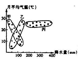 【小题3】丙为热带雨林气候,盛产许多著名的热带经济作物;甲为地中海气候,对应自然带为亚热带常绿硬叶林带;乙为亚热带季风气候,夏季高温多雨,冬季温和少雨,比丙为终年高温的热带雨林气候更适合人类居住。乙气候区内没有世界著名商品谷物农业区。