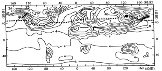 【小题2】根据经纬度定位判断,甲乙位置位于北美洲西岸,太平洋沿岸,本地区不是季风气候,所以A选项错误;等年较差分布是西北-东南走向,所以不是太阳高度角的年变化和寒暖流的影响;所以B、C选项错误;北美西海岸是世界著名的科迪勒拉山系,所以海陆位置和地形共同造成了甲到乙一线气温年较差变化快,所以选择D选项。