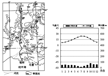 1、综合题 (15分)读罗讷河流域局部区域图(左图)和马赛气候统计图(右图),完成下列问题。