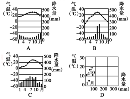 【小题1】读图可知,A地冬季温暖多雨,夏季炎热干燥,为地中海气候;B地冬季寒冷干燥,夏季炎热多雨,雨热同期,为温带季风气候;C地冬季温暖湿润,夏季炎热多雨,雨热同期,为亚热带季风气候;欧洲英国馆气候为温带海洋气候,冬暖夏凉,年较差小,全年降水均匀,故D正确。