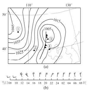 4、单选题 下图(a)为某日08时海平面气压分布图(单位:百帕),图 (b)显示④地24小时内风的变化。读图,回答下列各题。