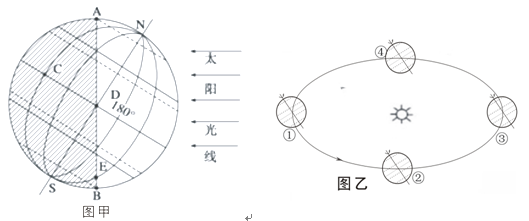 (5)图甲A、D、E、B四点正处于 (晨/昏)线上,E点的昼长为 小时;由A向D做水平运动的物体将偏向 。(东/西)(3分)