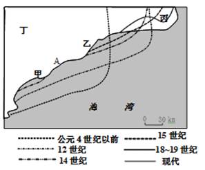 小题2:图中A处的海岸线自15世纪至现代,几乎没有任何变化,最可能的原因是