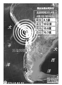 2、单选题  智利北部沿岸近海发生8.1级地震。读下图判断发生地震的地区分布在(   )