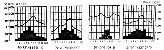 2、单选题 下图为我国30°N附近四个省级行政中心城市的降水量、日照数的季节分配图。据此判断下列各题。