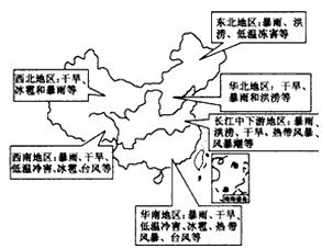 1、综合题 ? 民政部公布了2005年中国自然灾害情况,全年各类自然灾害共造成直接经济损失2042.1亿元;其中70%以上是气象灾害造成的,而且我国气象灾害种类多,强度大,频率高。下图为我国主要气象灾害分布图,读图回答下列问题。