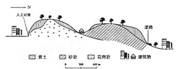 长江下游某城市边缘分布着丘陵,丘陵的基岩上有黄土覆盖(如图所示)。近年来,由于地域扩展,大量开挖山坡,该地在夏季暴雨后曾发生多起黄土崩塌、滑坡灾害。