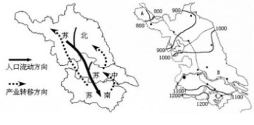 2、综合题  江苏是我们美丽可爱的家乡,读“江苏省近十年产业转移与人口迁移方向”和 “江苏省年降水量分布图”(图10), 回答下列问题。(7分)