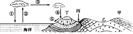 5、单选题 下图表示地壳循环模式,图中序号表示风化与侵蚀作用、沉积作用、变质岩、岩装岩、沉积岩和岩浆。读图回答1—2题。