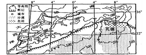 小题1:根据图中注记“地中海”进行定位,地中海以南的陆地为非洲,断层位于非洲,图中非洲区域在地中海沿岸为地中海式气候,而广大南部地区为热带沙漠气候,流水侵蚀作用微弱。A项排除;非洲板块与亚欧板块相向运动,地中海越来越小,BD项排除,C项正确。