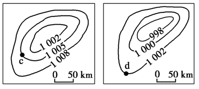 2.由图可知 a图、b 图等压线稀疏状况、比例尺、图幅相同,压力差越大( a图气压差为4百帕、b 图为2百帕、c图3百帕、d图2百帕),风力越大。所以a点风力大于b点风力;c点风力大于d点。若等压线疏密程度基本一致则比例尺越大(a图、b 图比例尺大于c图、d图),风力越大。A点、b 点的风力大于c点、d点。通过以上推出四幅气压分布图中,风力最大的点是a点。