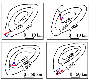 1.如果四图都位于北半球,a、b、c、d四地风向如下图所示:(蓝色虚线表示水平气压梯度力,红色实线表示风向):