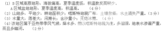 (1)图示B地区在一年中 ≥10℃的日数多于A地区,但积温反而低于A地区,分析其原因。(4分)