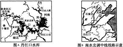 1、单选题 ? 丹江口水库水域面积为840平方千米,蓄水总量达81亿立方米、库区座落在群山环绕之中,这里气候适宜,空气清新,日照量高、南水北调中线工程的渠首就在这里,中线工程建成后,把丹汉二江之水送往华中、华北地区。举世瞩目的南水北调中线工程已经动工,中线渠首的知名度越来越高。不久,一条人间天河将把“渠首”景区和京津大地连接在一起。读图A和图B,回答(1)——(3)题。