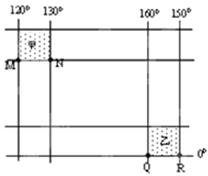 2、单选题 该图为局部经纬网图,甲、乙区域所跨的纬度相等(乙区域内有某著名火山岛),MN的实际距离约为QR的一半。据此,完成问题。