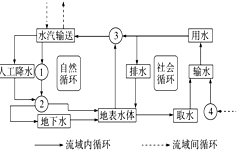 1、单选题 水循环包括自然循环和社会循环。读下图,回答下列各题。