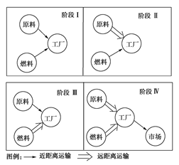 1.区位选择与图中所示发展阶段相符合的工业部门是2.图中反映出,对该种工业区位的选择