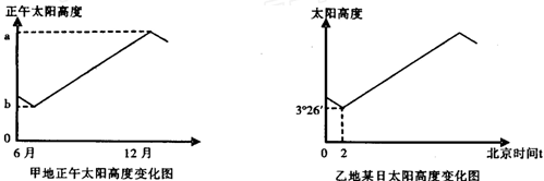 小题1:当甲地正午太阳高度为b时,乙地太阳高度如右图所示,则乙地的坐标为