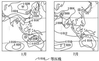 4、单选题 读世界某区域1月和7月海平面气压(单位:hPa)和风向图,①~⑥处的箭头表示风向,据此回答问题。