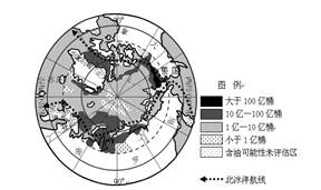 2、综合题 北极地区石油储量丰富,占全球未开采石油的13%到30%,图为“北极地区可能的石油储量及分布示意图”,读图回答下列各题。(13分)