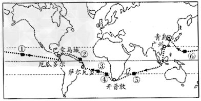 5、综合题 我国“大洋一号”科学考察船自2010年12月8日于广州起航,2011年12月11日圆满完成第22次环球科学考察任务凯旋青岛。下图为“大洋一号”科学考察第22次环球科考航线示意图。读图回答。