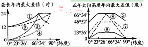 1.地表各地昼长、正午太阳高度年内最大差值随纬度变化的曲线分别是2.如果某地夏至日3:00日出于东北方向,则该地纬度大约是