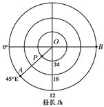 材料一 下图为某时刻的等日照时间图,OA、OB为日期界线,P点纬度为70°。