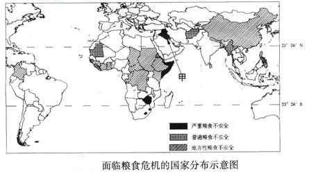 本题解析:此题难度不大,热点粮食问题是大家熟悉的,认真看图,就可以很快得出前4问的答案,第(1)问,从图1可知面临粮食危机的国家主要分布在亚洲和非洲;第(2)问,确定甲是位于西亚的伊拉克,属于热带沙漠气候,则其发展种植业的最主要限制因素是灌溉水源;第(3)问,根据图2可知;第(4)问,由图3可知;第(5)问,是开放性试题,学生结合中国国情,充分发挥自己想象空间,注意从多个角度来答。