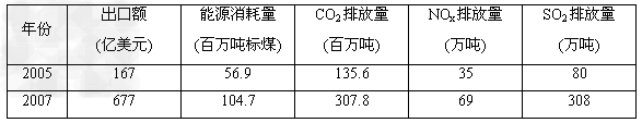 5、单选题 下表示意2005~2007年我国主要高耗能产品出口额、能源消耗量、温室气体和污染物排放量。完成1~2题。