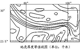 4、单选题  下图是某区域地壳厚度等值线图,读图回答下列小题。