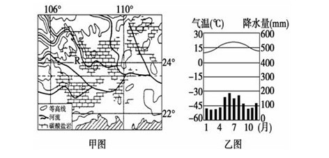 (2)乙图为该地区某城市年内各月降水量与气温图,试判断其气候类型并描述其气候特点。(6分)