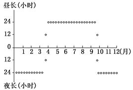 小题1:从图中可以看出,该地在每年10月到次年3月夜长为24小时,出现极夜现象,每年4月到10月昼长为24小时,出现极昼现象,符合北极点附近的昼夜长短变化规律,所以D项正确。