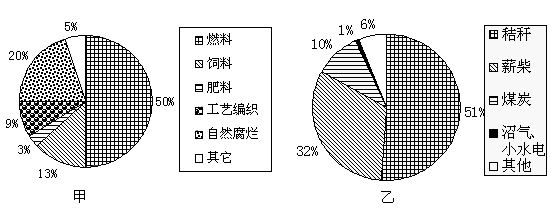 3、单选题 读“江南丘陵地区某县农村生活用能构成图(图甲)”及“该县农村秸秆利用方式比